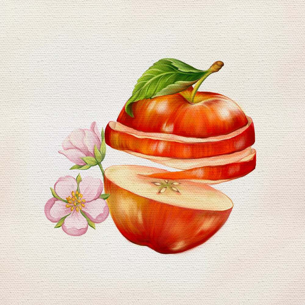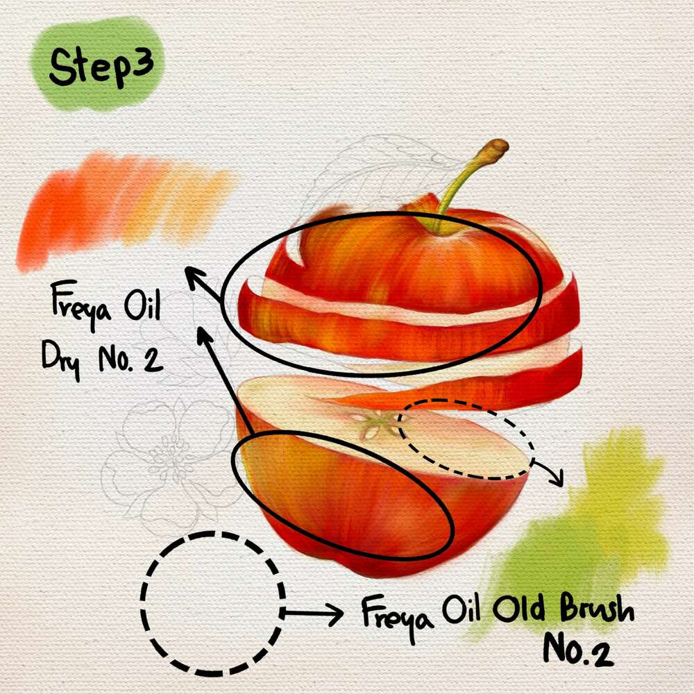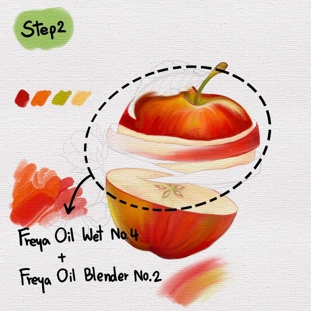Step 2: Slowly add gradient colors to the top half of your apple using Freya Oil Wet on Wet No. 4 and Freya Oil Blender No. 2 Add a bit of light green and yellow highlights on top.