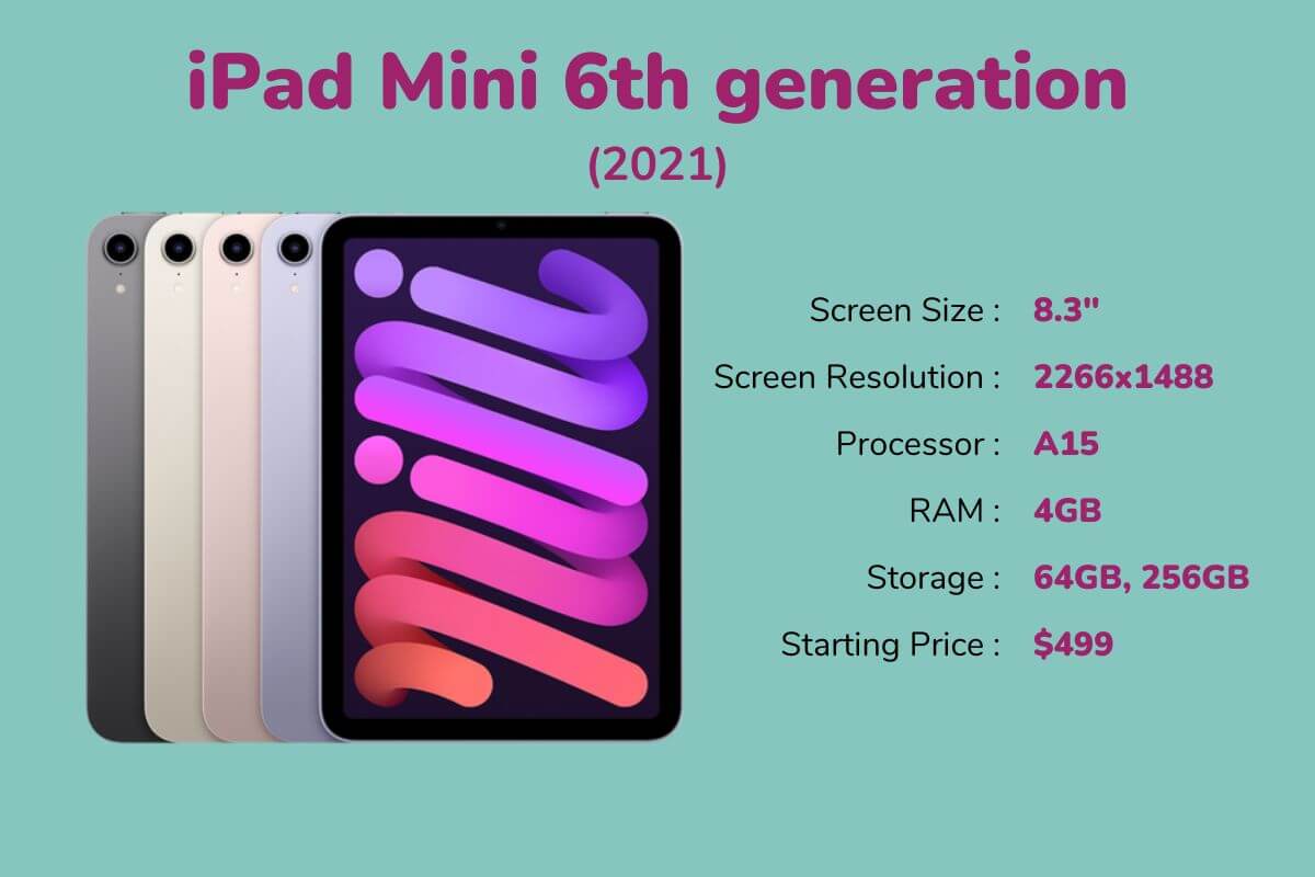 The iPad mini is the iPad’s pocket-friendly version. At 8.3”, you can usually hold it using one hand, so this one boasts when it comes to portability. This model also offers 64 GB and 256 GB storage options, but with 4-colors to choose from and with an A15 bionic chip.