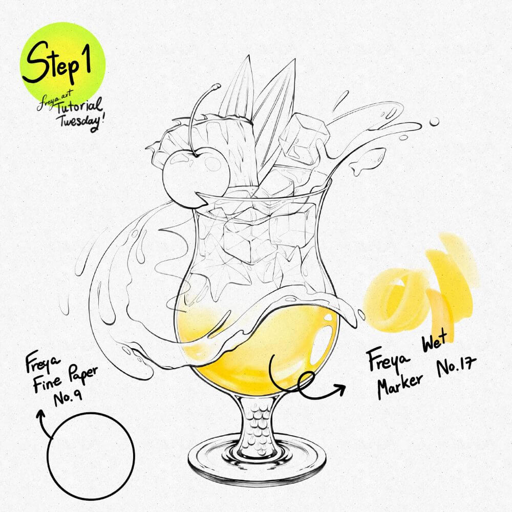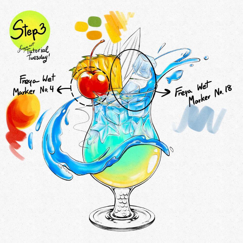 Step 3: On a different layers, color in the details for the fruits and ice cubes using Freya Wet Marker No. 4 and Freya Wet Marker No. 18