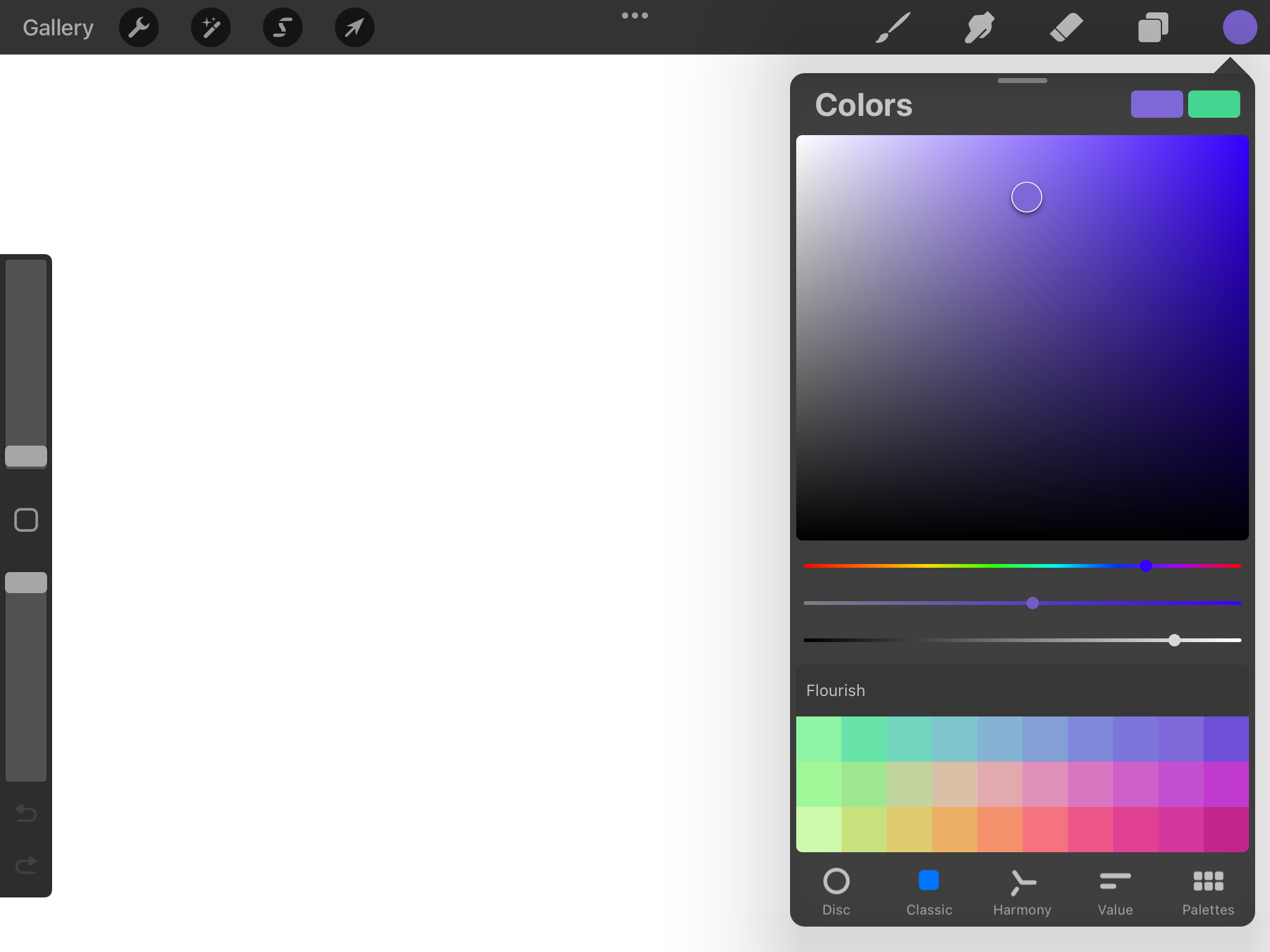 Choosing colors with Procreate is pretty simple. You can choose between different interfaces when it comes to choosing colors in Procreate. To choose a color, simply go to the circle in the top-right corner of your workspace.