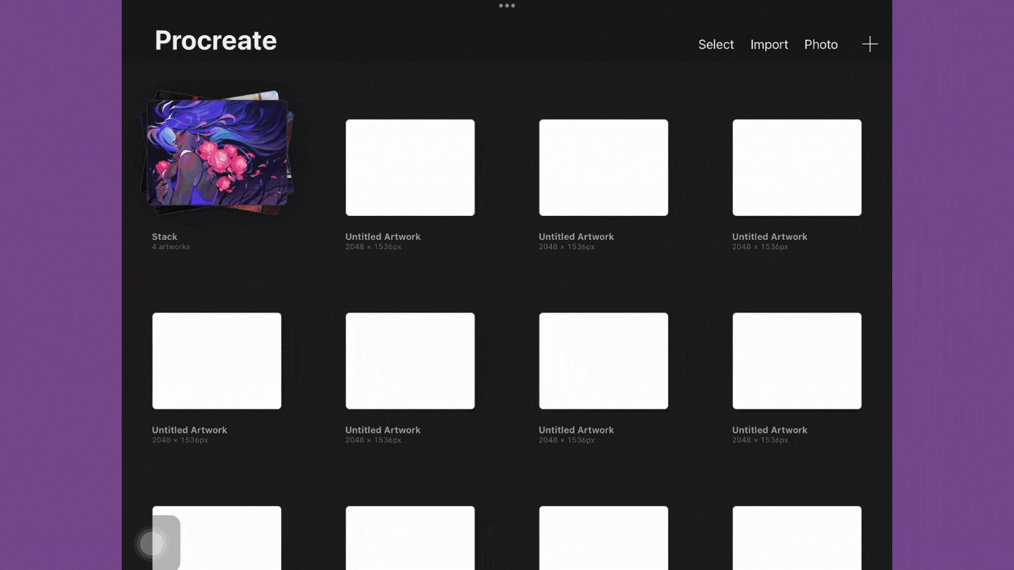 Select allows you to choose multiple Artworks at once and gives you a few options to work with. After selecting artworks, you can tap on ‘Stack’ to group them and help organize your gallery view. You can also use this to mass export, duplicate, and delete multiple files.