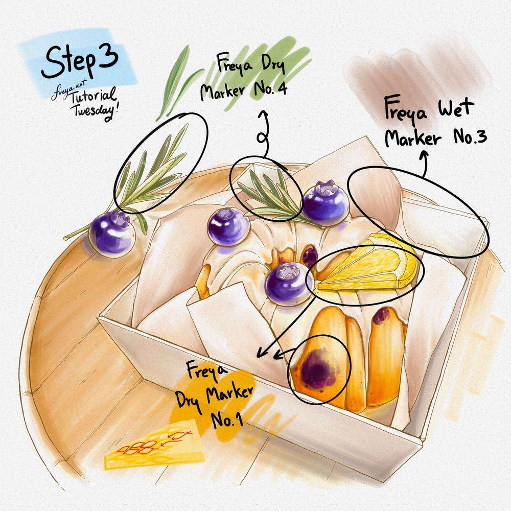 Step 2: On a different layer, build up the colors for the blueberries using Freya Dry Marker No. 1 and Freya Wet Marker No. 18 for the cake. Remember to add white areas to serve as highlights.