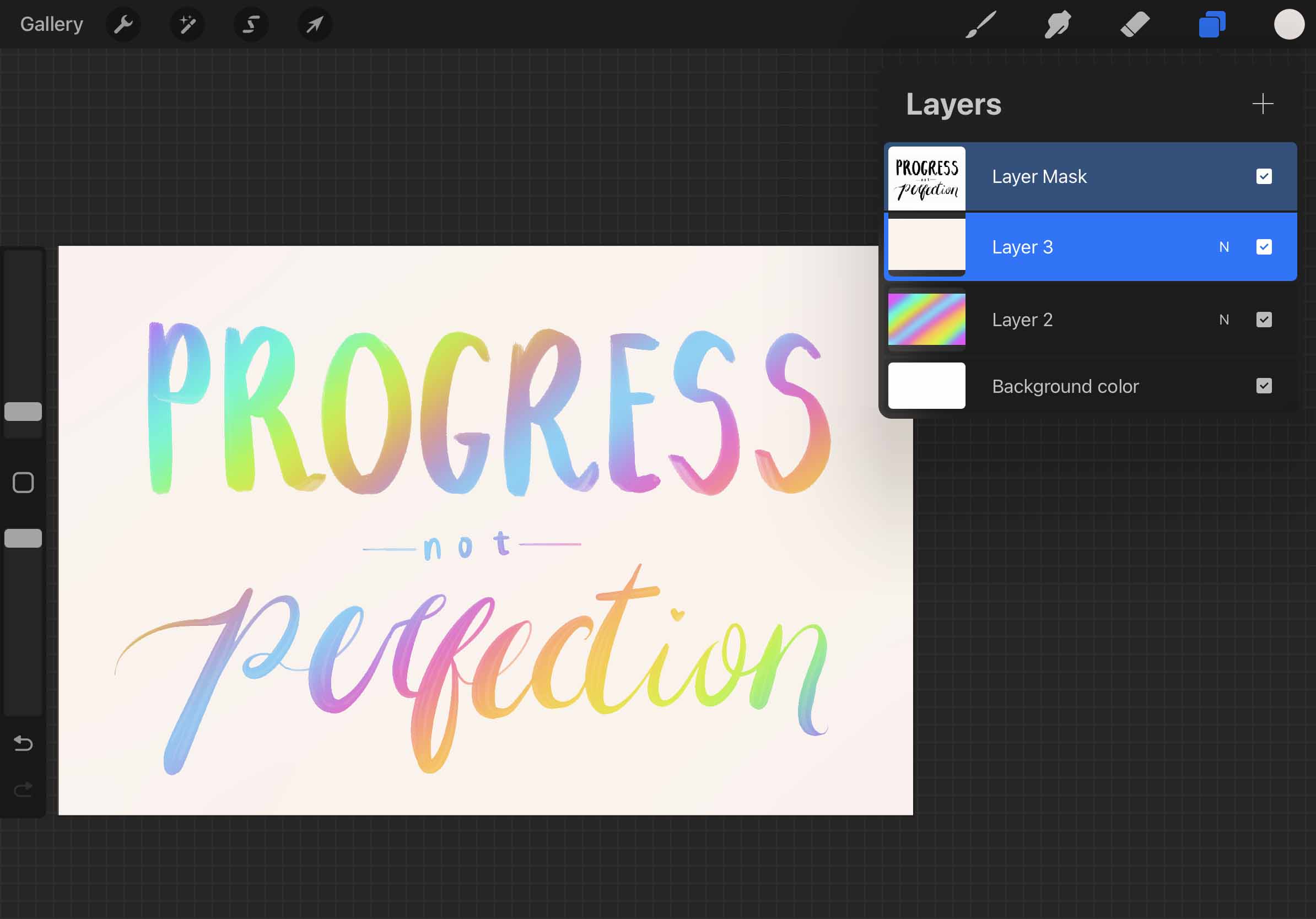Step 3. Make a new layer on top of everything and fill it with a light color. Click on that layer and select Mask. Choose a calligraphy brush. For this exercise, I’ll be using Freya Marker Lettering 5 and Freya Oil Lettering 10 and in that new Mask layer, we’ll be using black to do our lettering.