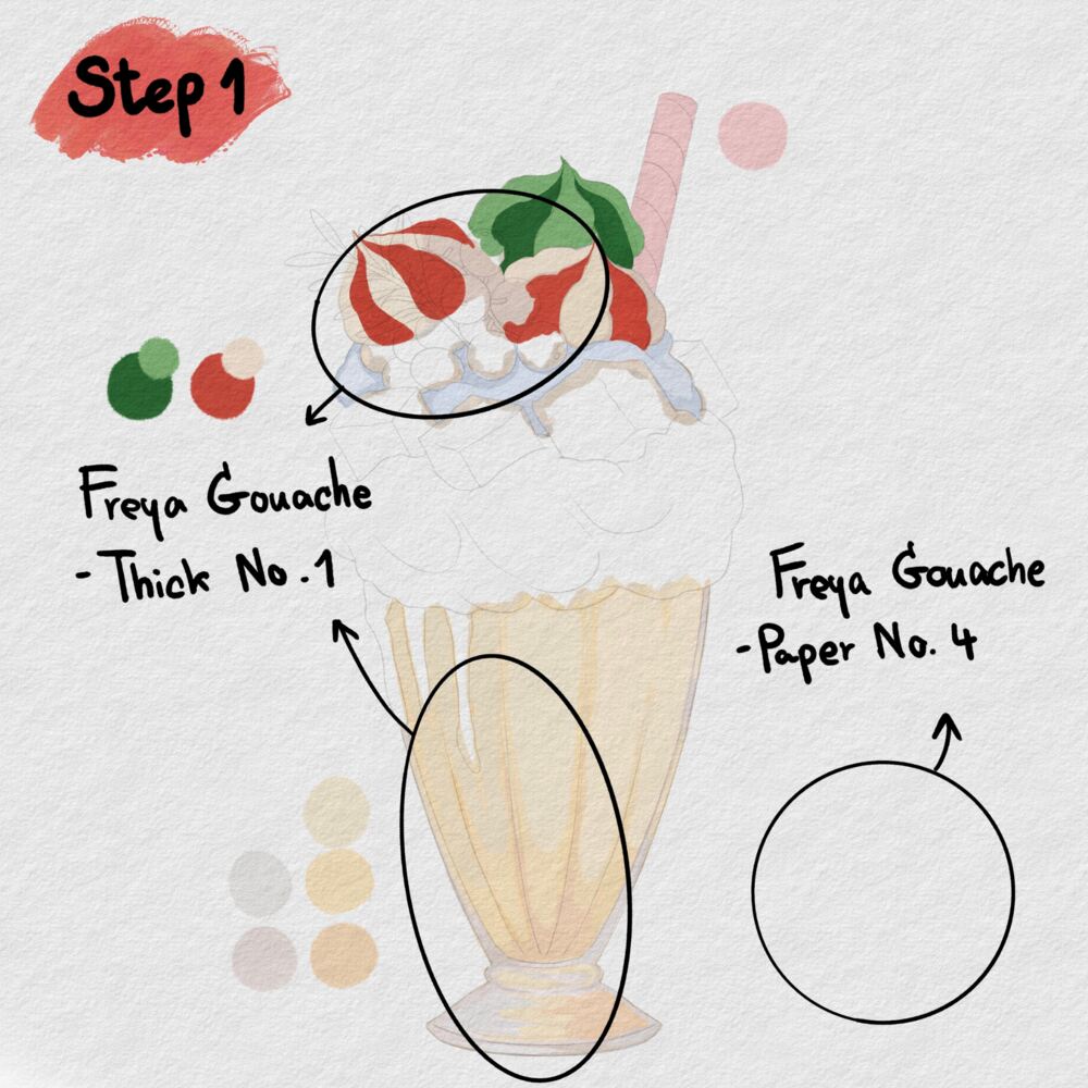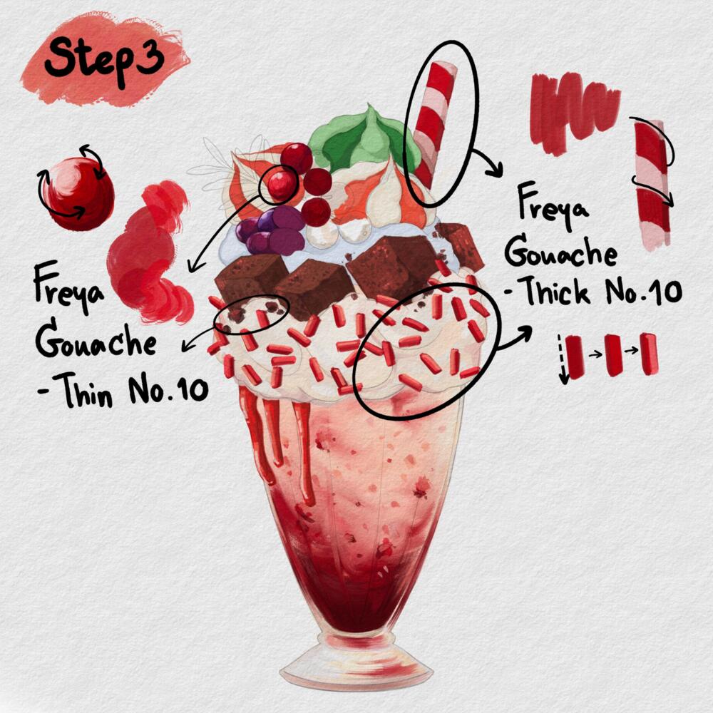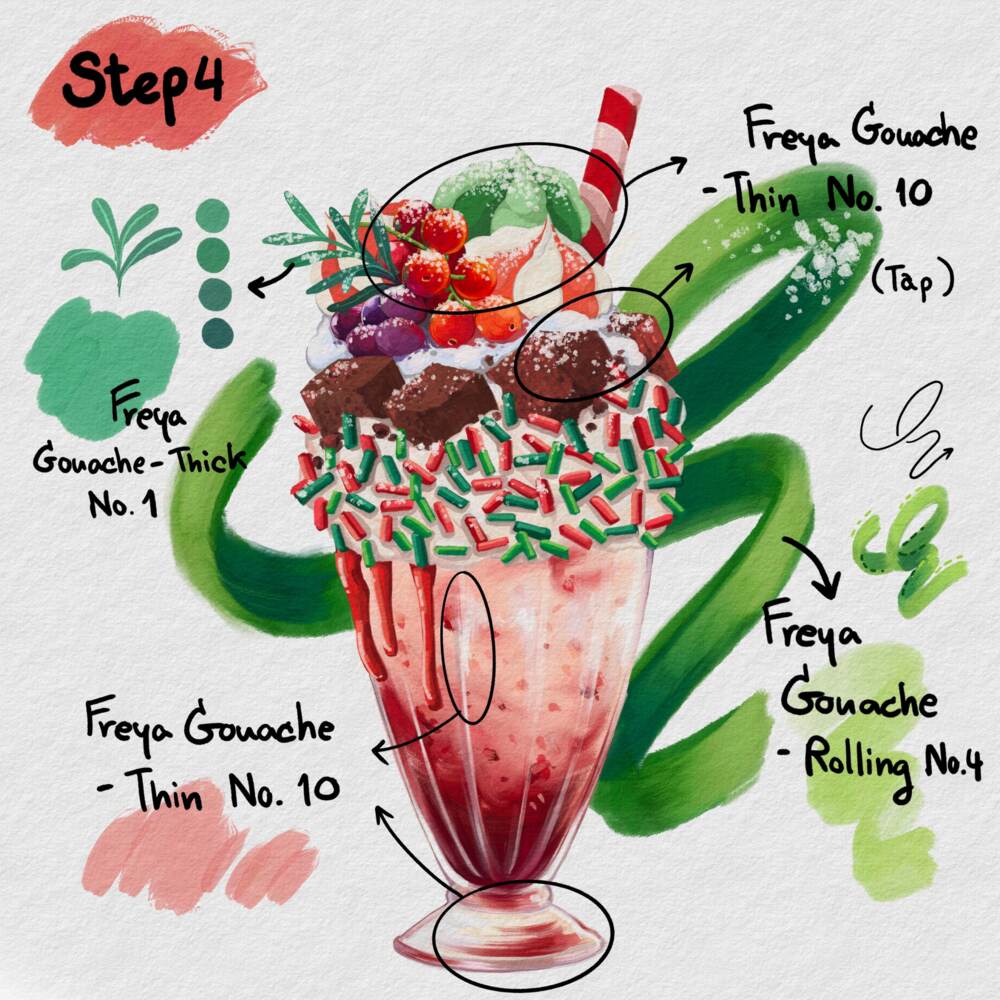 Step 4: Finally add the finishing touches! Use Freya Gouache Thin No. 10 in light tapping strokes to create your sugar sprinkles. Then use Freya Gouache Thin No. 10 to add shadows and highlights to the glass. And finish off with a background accent using Freya Gouache Thick No. 1 and Freya Gouache Rolling No. 4.