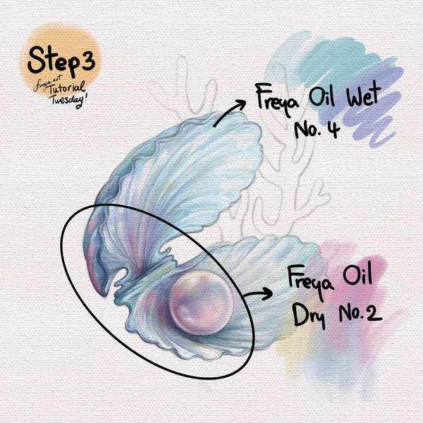 Step 2: Using an outward sweeping motion, add in the shell detail with the Freya Oil Wet No. 4. Use a bit of purple to give the illusion of an iridescent surface.