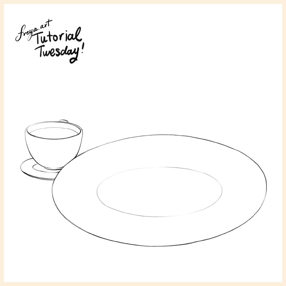 Step 1: Let's begin by creating a sketch of our composition using 6B or Peppermint Brush. Let's start with the plate and cup first.
