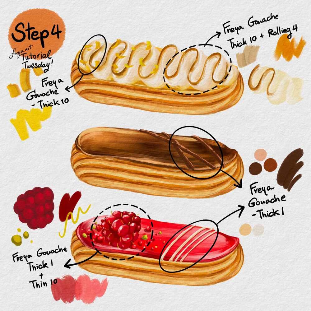 Hello and welcome! Today we're doing a going to draw some yummy eclairs using the sampler brushes from my Realistic Gouache Brush Set! Please download the tutorial files first. You'll get the tutorial PDF, free Gouache brushes, sketch and palette swatch for this project.