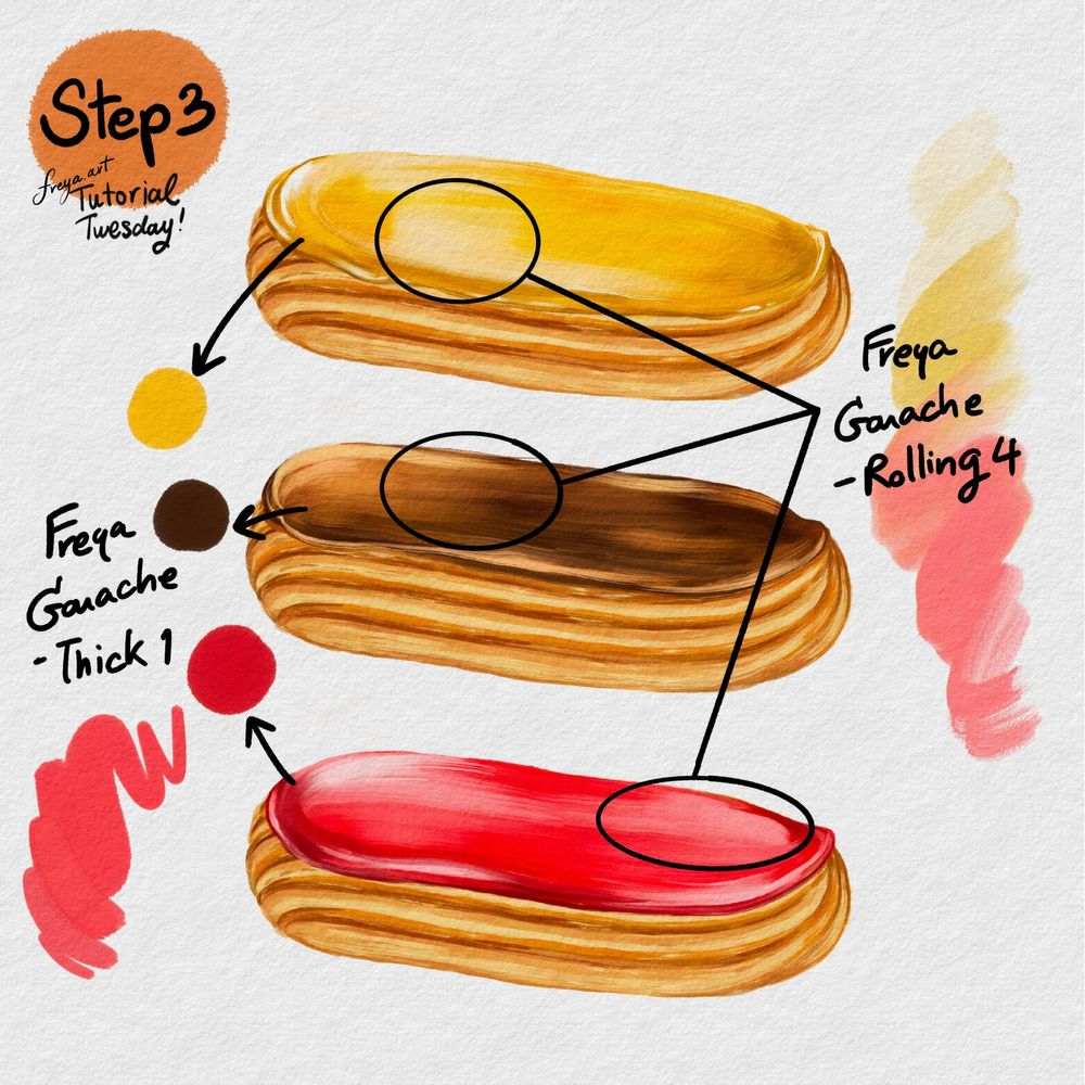 Step 3: Now for the fun part! We're going to decorate our éclairs with different flavors. Add another layer for each éclair. Then use Freya Gouache Rolling No. 4 for the base color and Freya Gouache Thick No. 1 to add texture.
