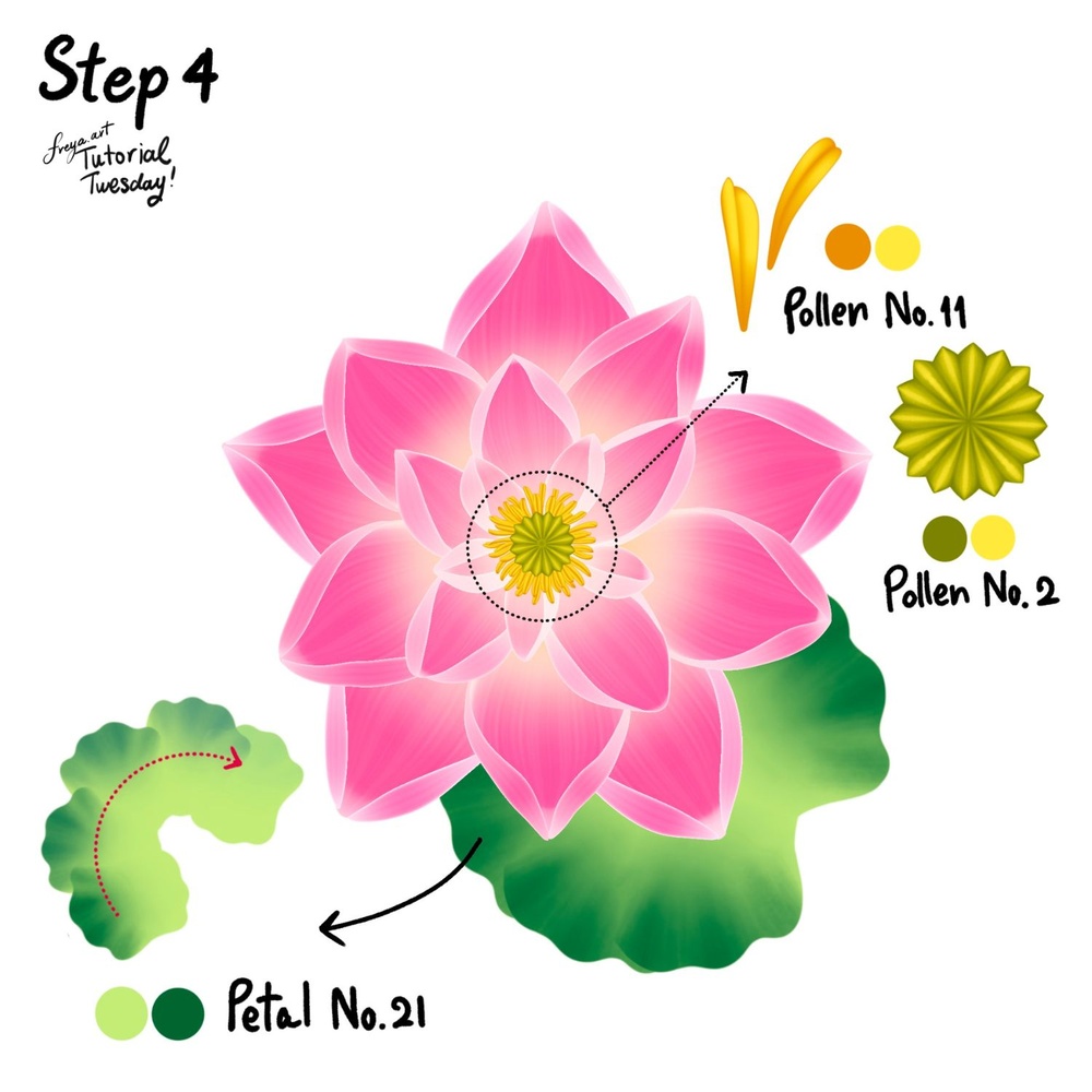 Step 4: For the pollen, add a layer on top of the petal layer, and use Pollen No. 11 first. Create a circle and then top it with Pollen No. 2 in the middle. Now add a layer below the petals for the lotus leaf. For this use Petal No. 21 and draw in a clockwise direction.