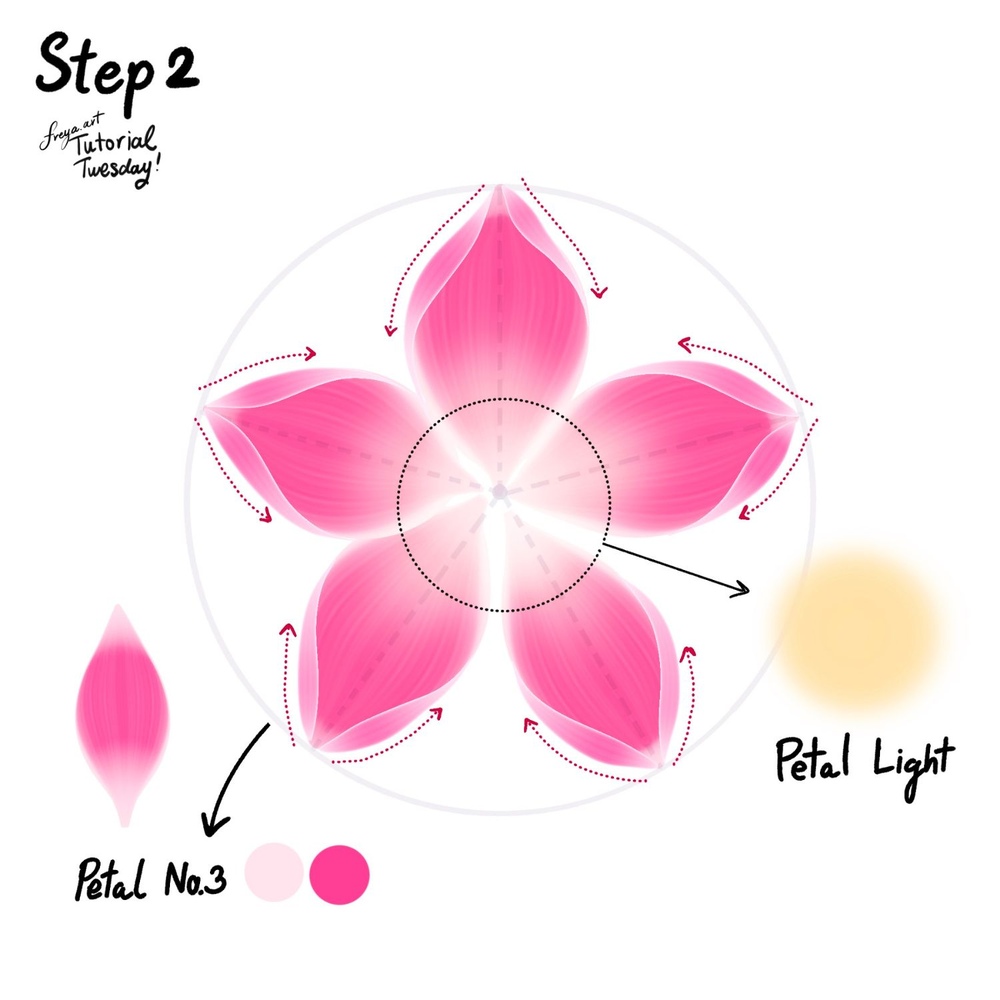 Step 2: Add smaller folds around the top of the petals using the same brush. After that, set the layer to Alpha Lock and lightly add a light yellow color in the middle using the Petal Light brush.