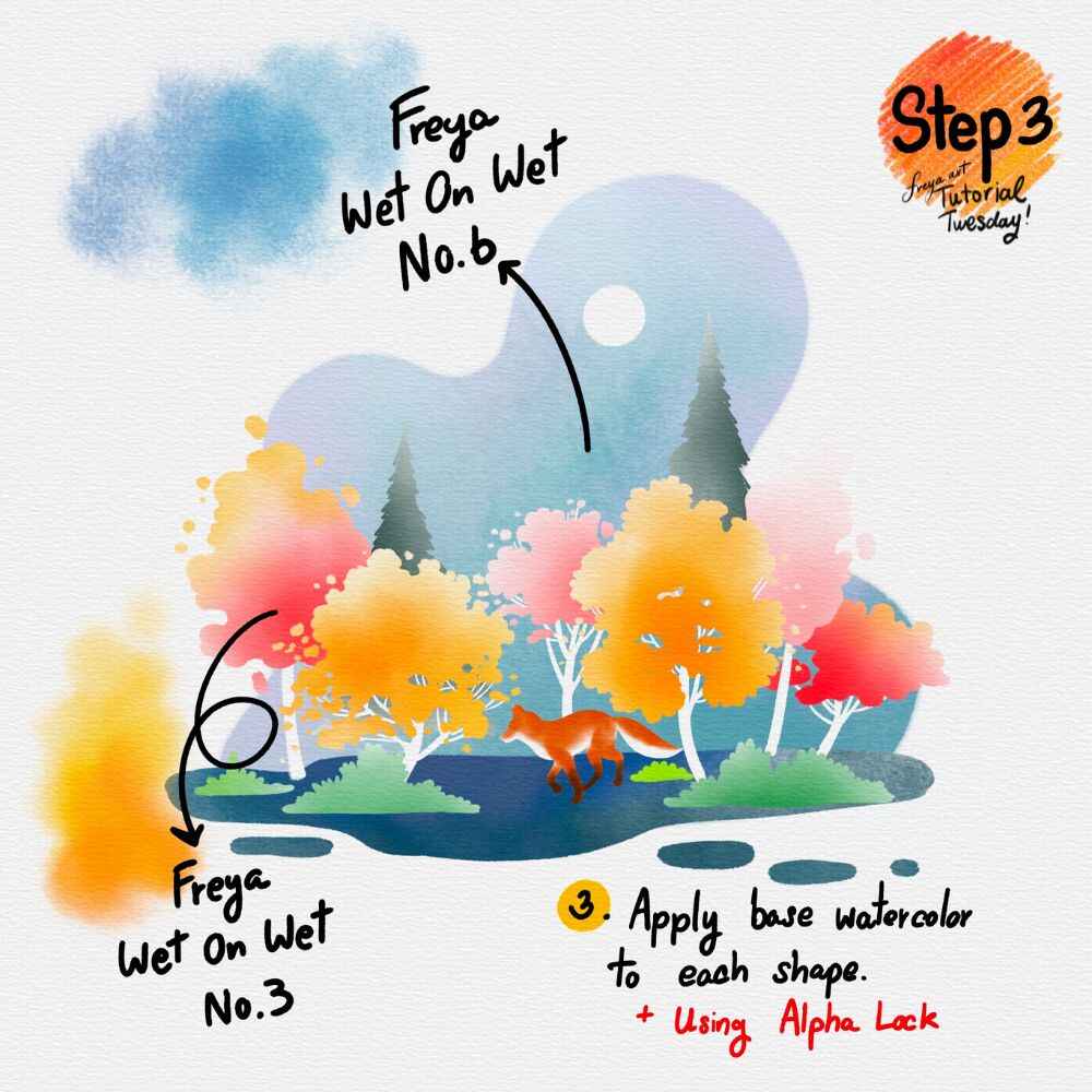 Steep 3: Once you have the shape layers ready, you can now add a base color to each shape using Alpha Lock. Use Freya Wet on Wet No. 6 and Freya Wet on Wet No. 3, add gradient color and texture to the base color.