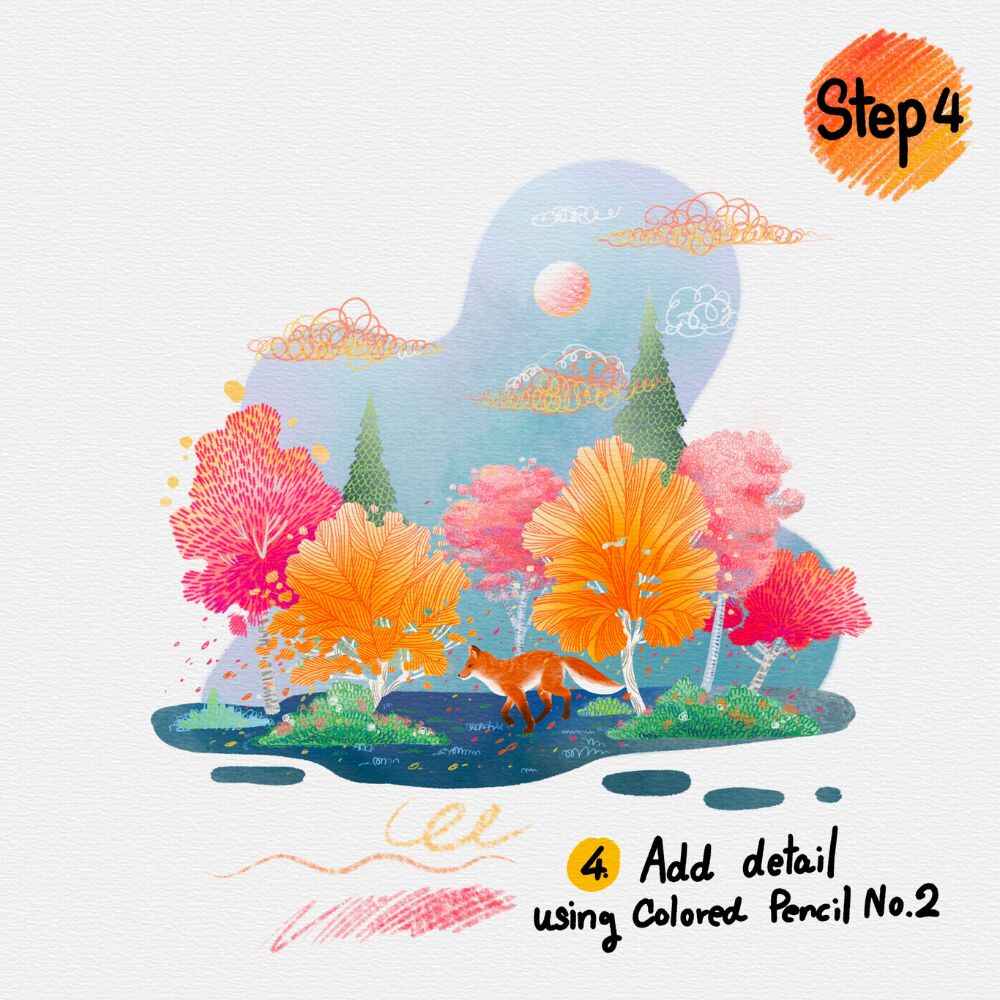 Step 4: Using a clipping mask on top of the shapes, add details using Colored Pencil No. 2. This will add the dreamy whimsical feel to the illustration.