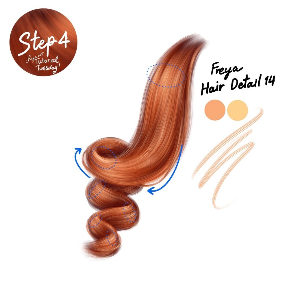 Step 4: Add another layer. And this time using the Freya Hair Detail No. 14 brush, we’ll add more intense highlights in areas we really want to pop. Use this sparingly, we don’t want to overwhelm the mid-tones. Just add them to the top of curves that would normally catch light or bounce light.