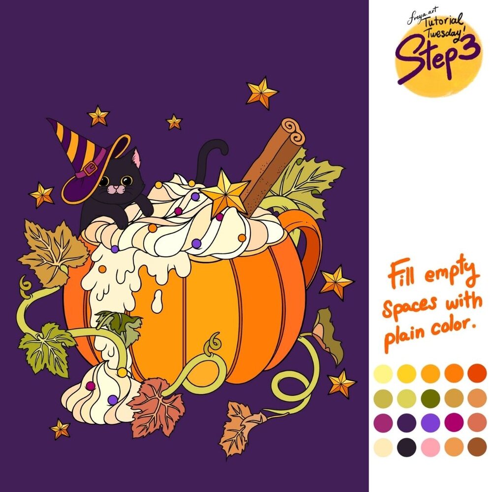 Hello! In this tutorial, we are going to explore Procreate's tools and basic brushes to color this Halloween Kitty and his Pumpkin Latte.