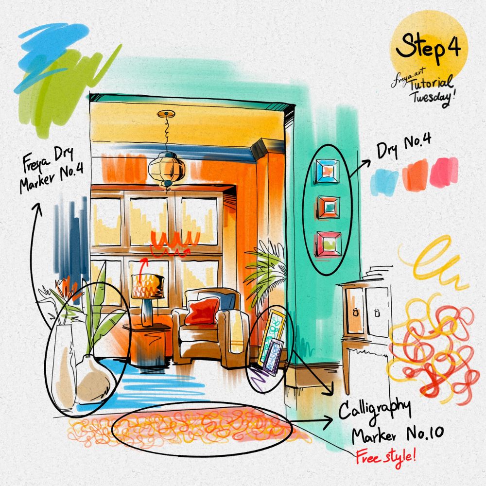 Step 4: Add the finishing touches using Freya Dry Marker No. 4 and Freya Calligraphy Marker No. 10. For the rug and lampshade, you can just scribble free style to add texture. Again, leave out some parts white so that it acts as shine or highlight. Congratulations, you've just completed this Interior Design Illustration using the Freya Better Marker Brush Set!