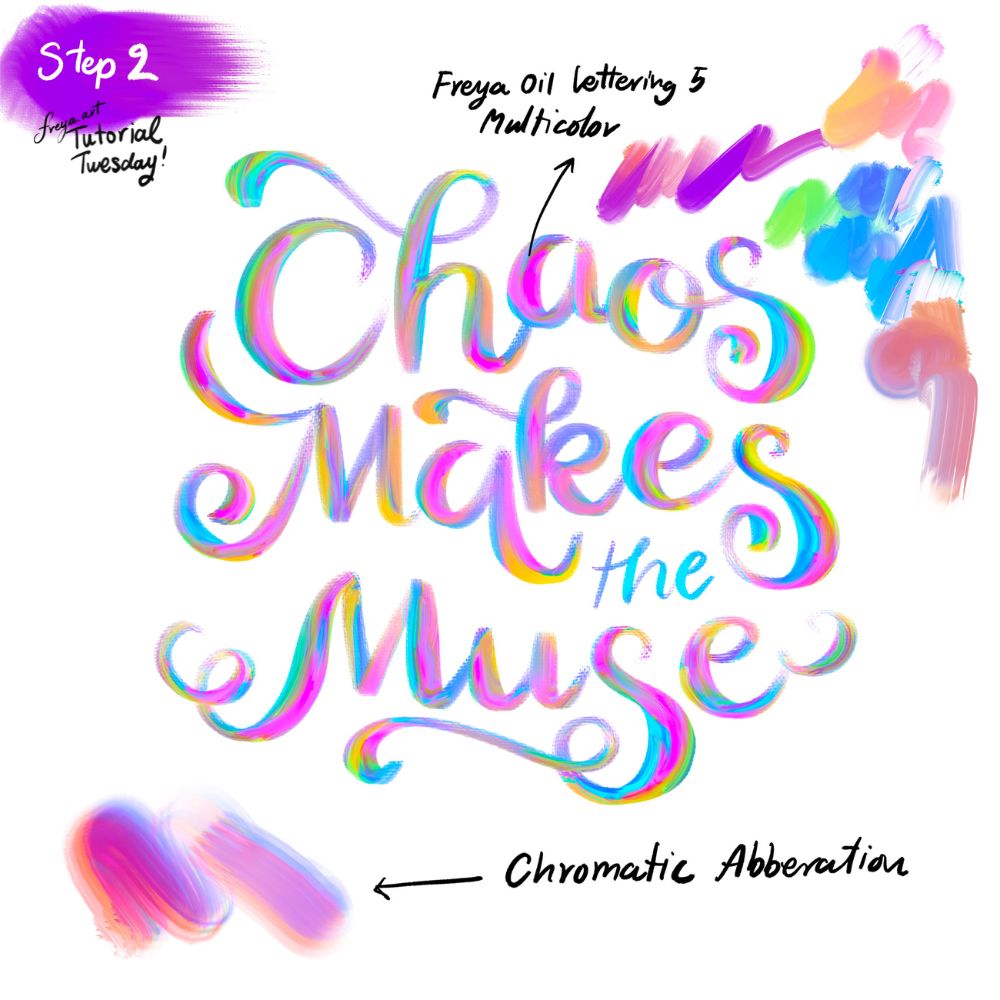 Step 2: Next, add another layer as a clipping mask, and using the Freya Oil Lettering 5 Multicolor Brush, paint over the first layer. Then go to Adjustments and pick Chromatic Aberration. Hold the pen down and swipe left to right to tweak the color aberration. Experiment a bit!