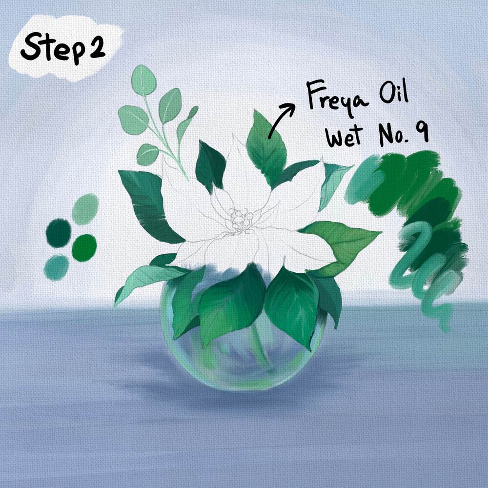 Step 2: Color in the leaves using Freya Oil Wet No. 9. Take note of how shadows will fall. Objects appear darker when they are closer to other objects as well.