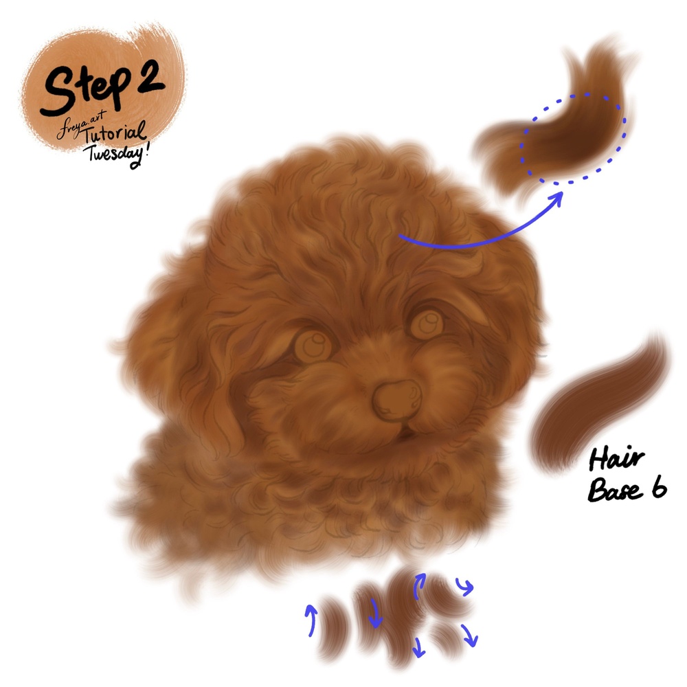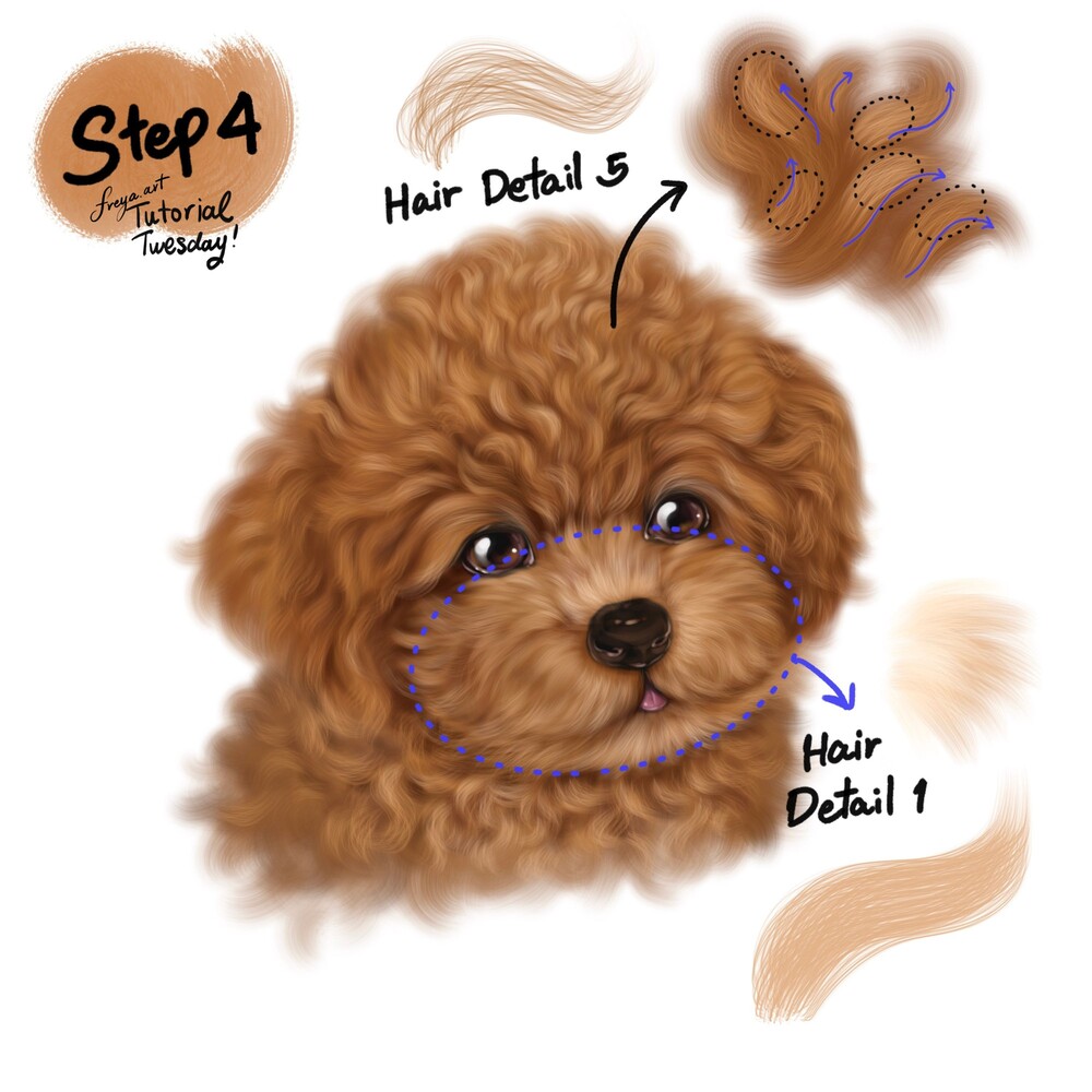 Step 4: Now add another layer, using Hair Detail No. 5 add the highlights to the top of the head. It’s still curly but direction is upward and outward. Use Hair Detail No. 1 to add highlight to the snout. The fur should move outward from the nose.