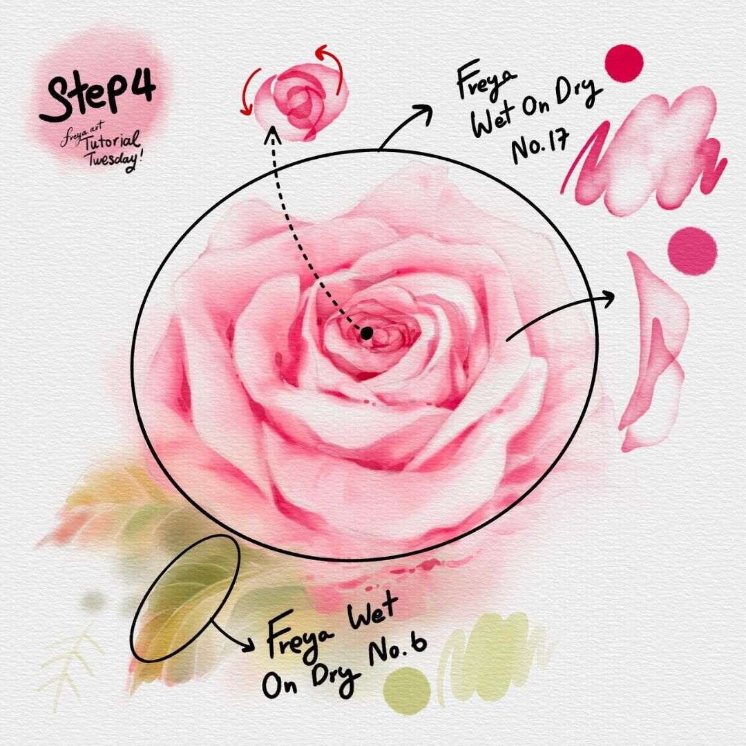 Step 4: Add the finishing touches on the rose center by using Freya Wet on Dry No. 17. As you add pressure, the brush will dilute the color. So move your strokes in a circular motion as you do this. For the leaf veins, add a clipping mask and use Freya Wet on Dry No. 6 in a light green color.