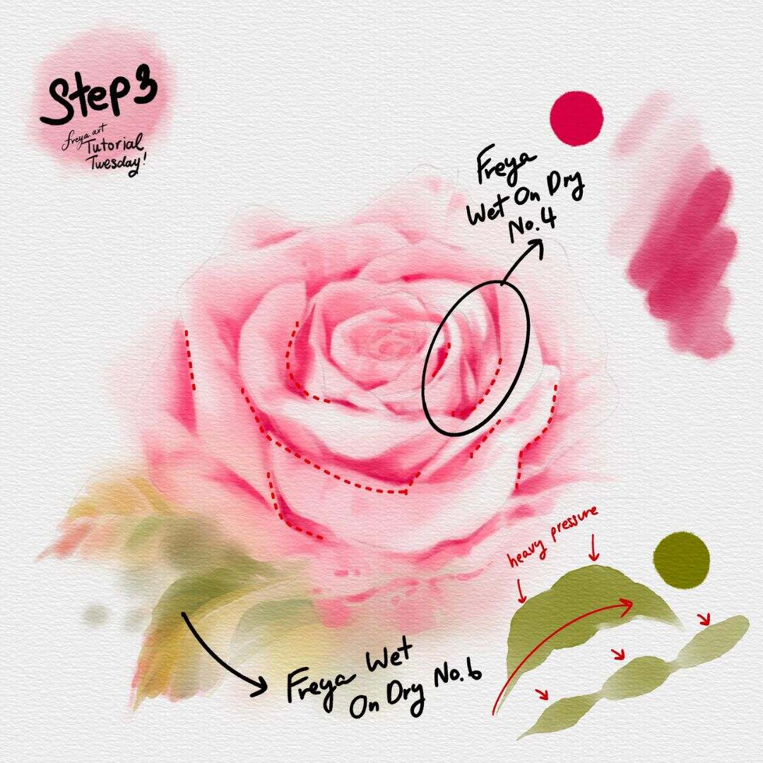 Step 3: Add another layer and using Freya Wet on Dry No. 4 brush, continue adding more emphasis in between petals to add depth. Line some of he petal edges using a pinkish red color. Don't be afraid of the intensity, as this acts our shadow and will give your rose it's structure. For the leaf, use Freya Wet on Dry No. 6 and firs create a curved line. Then draw the leaf shape by applying pressure outward.