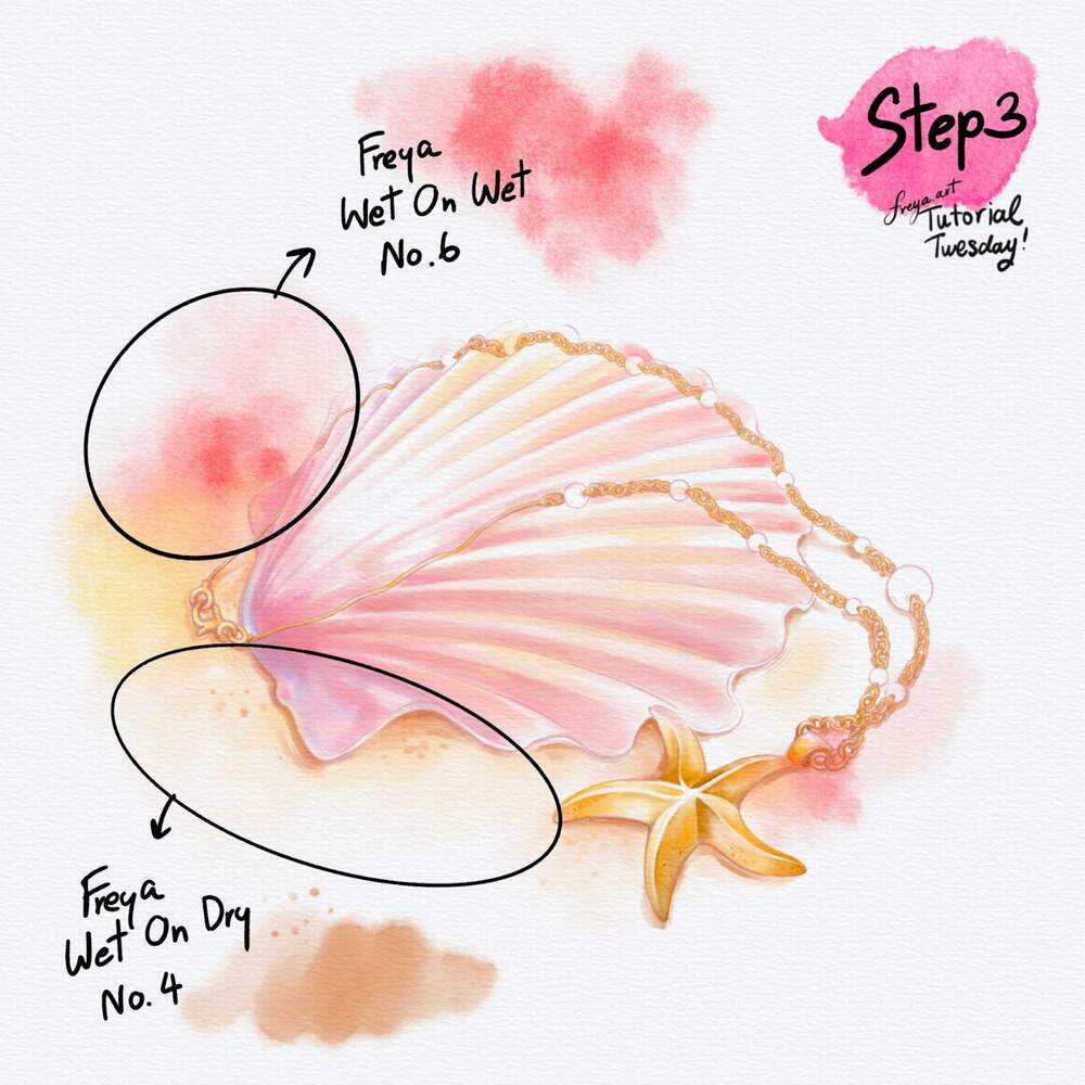 Step 3: At this point, you can start adding some backdrop detail using Freya Wet on Wet No. 5 Brush. Add a bit of shadow under the shell using the Freya Wet on Dry no. 4 brush. Use a light brown color so that it still blends with the composition.