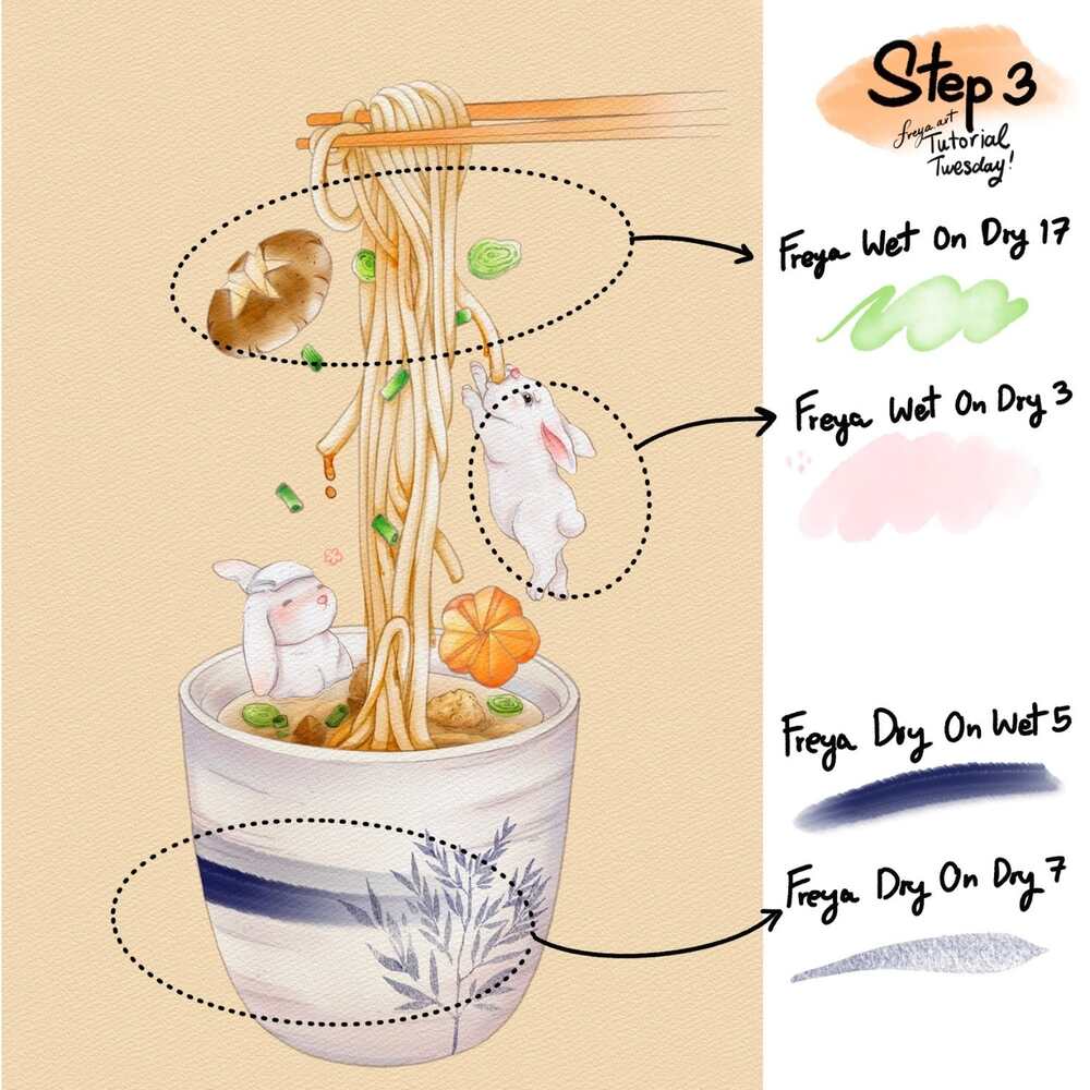 Step 4: For the finishing touches, add another layer on top and add steam using Freya Wet on Wet 6 around the noodles and the bowl.