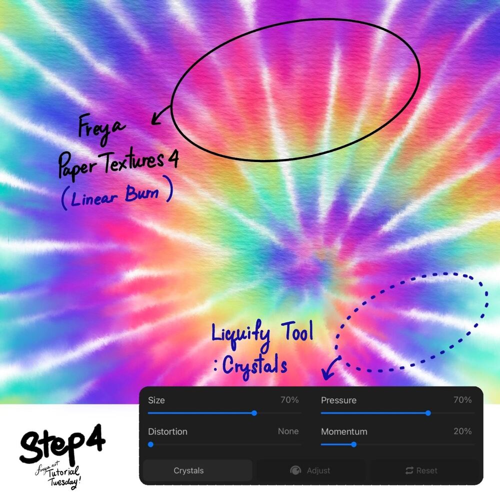 Step 4: Once you're done with the colors, let's distort it a bit with the Liquify tool > Crystals. Use the settings as shown. Then add another layer for the texture. Use Freya Paper Texture No. 4 brush, and set it to a very light grey color. Paint all over the canvas. Then set that layer to Linear Burn or LB. Now it has a nice paper texture.