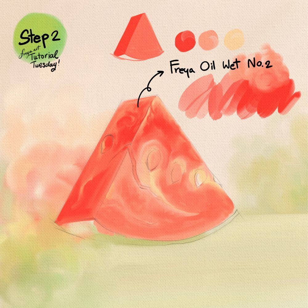 Step 2: Let's color the base layer for the watermelon using Freya Oil Wet No. 2 in shades of red, pink, and light yellow. Red for the side and pink for the front, because it's supposedly facing the light.